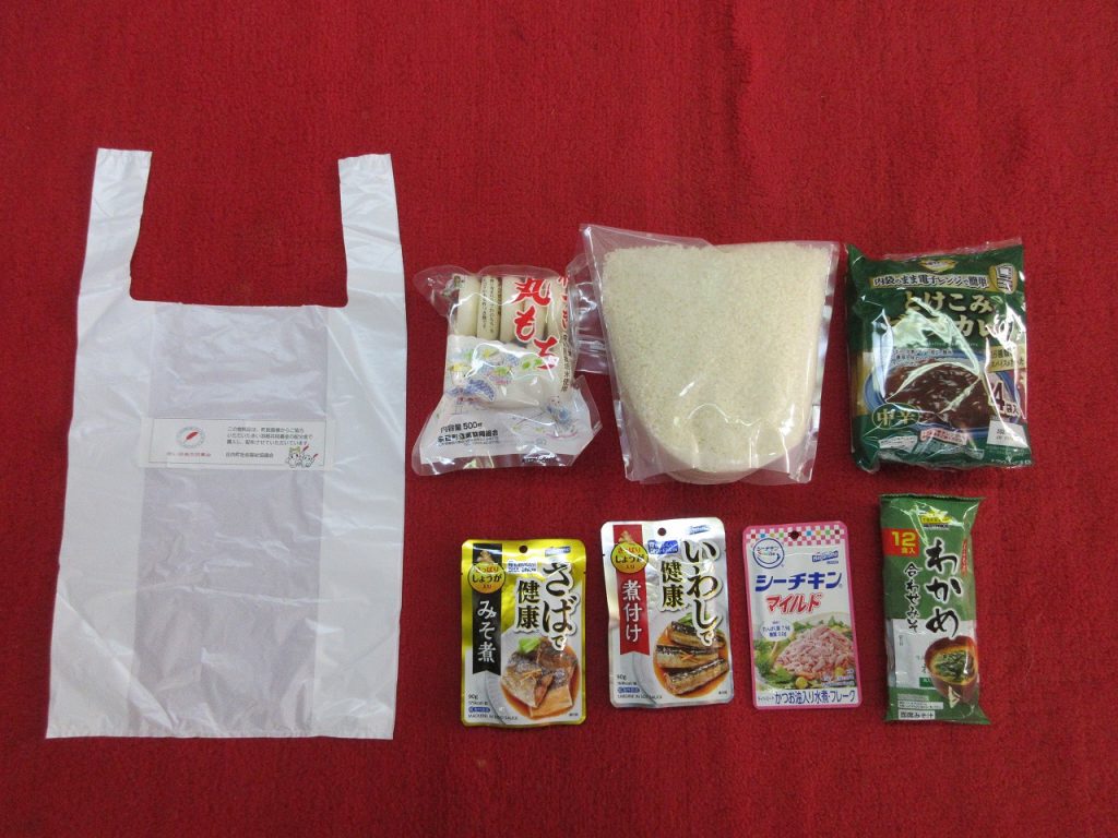 当該事業で購入した食料品と合わせて、余目町農協様からいただきました「丸もち」と庄内町様からいただいた「精米」を配布させていただきました。